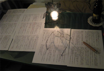 面積二倍に拡大印刷した原稿、赤ペン、シャーペン、眼鏡、蝋燭。